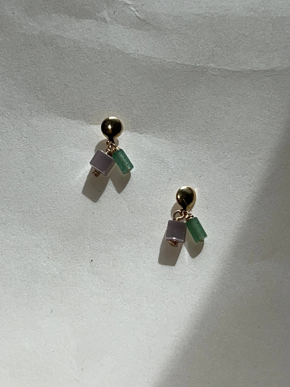 Pair of earrings with gold hooks and light blue gemstones on a beige background