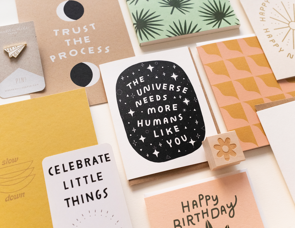 Greeting card with geometric design and 'Many Thanks' text on a wooden stand.